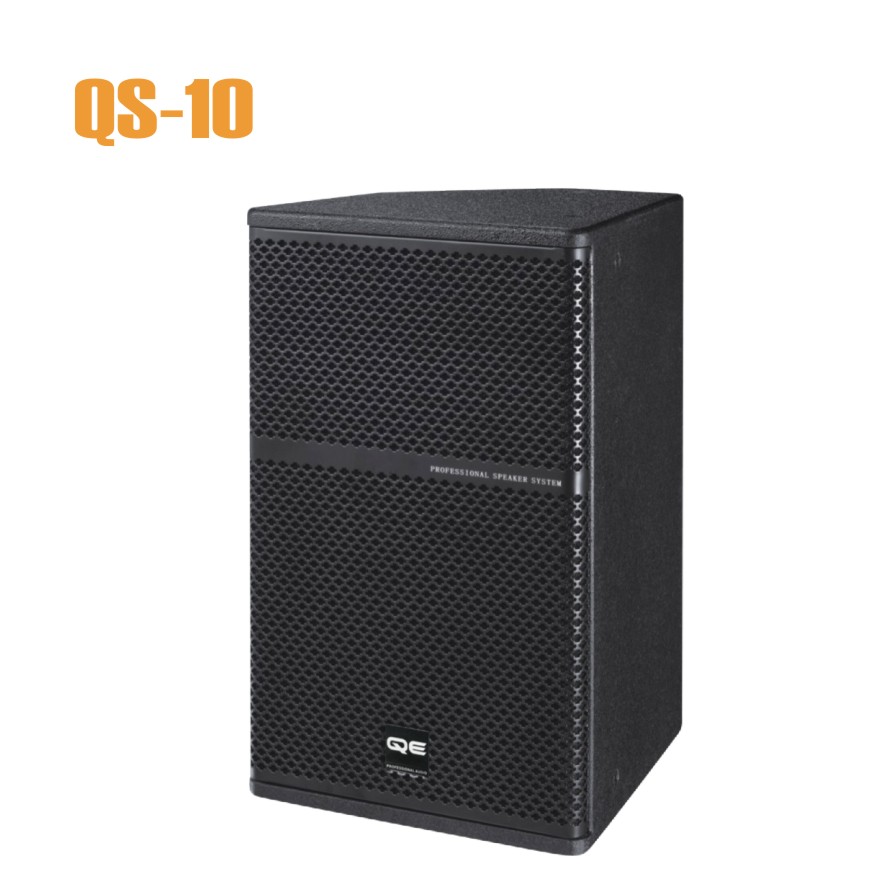 ● QS-10采用梯形外观设计,箱体采用18厘中纤板制作,外喷黑色耐磨点漆;配一个内置提手,一个全铁托盘,便于搬运和支撑。配一个Speaker四芯插座,三个防震脚垫。箱体采用多点吊挂,应用方便灵活。