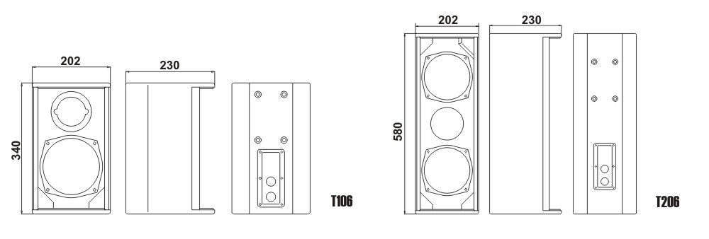T-106/T-206为6寸音柱,竖直方向排列紧凑 ,声耦合良好,为准线声源特性,在竖直方向具有较为尖锐的指向特性,声音传送距离远,声能量充沛,声音清晰度强。水平方向扩散宽广。在会议,广播,电教,休闲场所具有*的应用效果;广受客户欢迎。