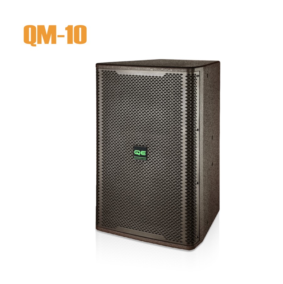 ● QM-10采用梯形外观设计,箱体采用18厘板制作,外喷咖啡色水性环保漆;一个全铁托盘,配2个Speaker四芯插座,采用全铝钢网;箱体采用多点吊挂,可以方便灵活采用横吊和竖吊。