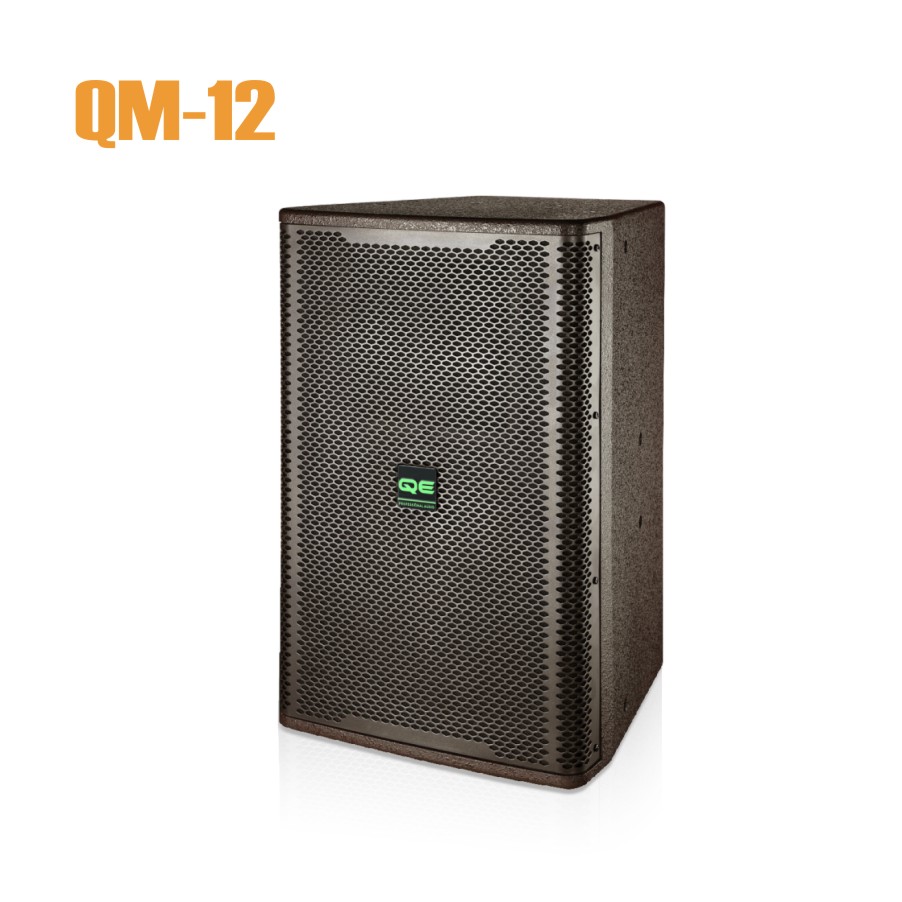 ● QM-12采用梯形外观设计,箱体采用18厘板制作,外喷咖啡色水性环保漆;一个全铁托盘,配2个Speaker四芯插座,采用1.8厘铁网;箱体采用多点吊挂,可以方便灵活采用横吊和竖吊。
